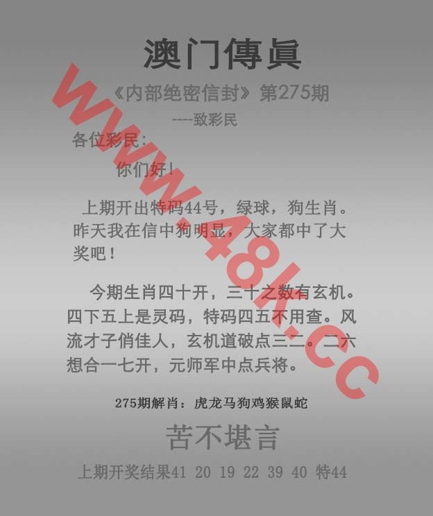 275期三肖 | 狗 鼠 猴 | 开:鸡 45 |